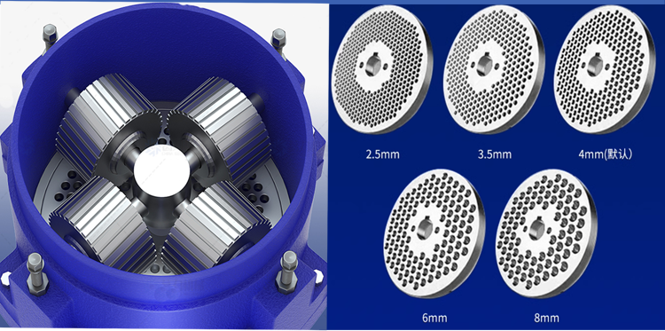 6. 飼料顆粒機(jī)的磨盤孔徑尺寸的大小,是根據(jù)客戶要求安配一種規(guī)格的磨盤,請您在和我們的交流過程中,告知我們您養(yǎng)殖的動物種類,養(yǎng)殖動物的大小,這樣方便我們給您推薦適合您的磨盤規(guī)格。