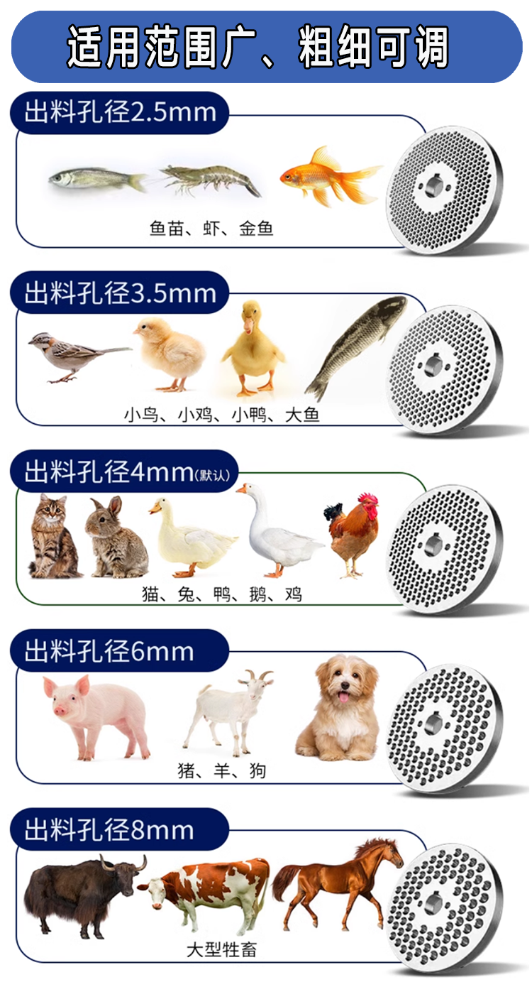 根據(jù)我們多年的客戶積累經(jīng)驗,養(yǎng)殖的動物種類不同,所選擇的顆粒機(jī)磨盤磨孔也不同,我們提供多種顆粒機(jī)規(guī)格磨盤孔徑,供您選擇。(顆粒料的長短,客戶是可自由調(diào)節(jié))